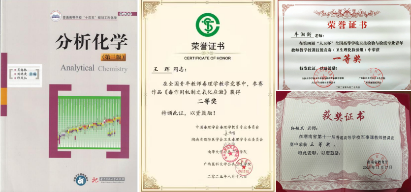 主编出版 “十四五” 规划教材 1 部,主编或副主编 7 部国家卫健委规划教材待出版;获湖南省普通高校教育教学成果二等奖2项;湖南省教改重点项目1项、教育部产学合作协同育人项目1项;获第四届全国高等学校卫检专业青年教师教学授课技能竞赛一等奖1项、二等奖1项、优秀教案奖1项;获中国毒理学会毒理学教育专业委员会第七届高校毒理学教育论坛教师教学基本功比赛二等奖4项、优秀教案奖1项;获湖南省国家安全教育课程教学展示活动三等奖1项;获湖南省第十一届普通高等学校军事课教师授课竞赛三等奖1项。