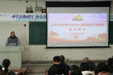 11月20日,南华大学公共卫生学院2025年入党积极分子培训班结业典礼在形态楼201顺利举行。学院党委书记龙鼎新、党委副书记曾志伟出席会议,辅导员、培训班班主任蒋剑红、彭芳君及全体学员参加活动,典礼由学工办主办孙越龙主持。