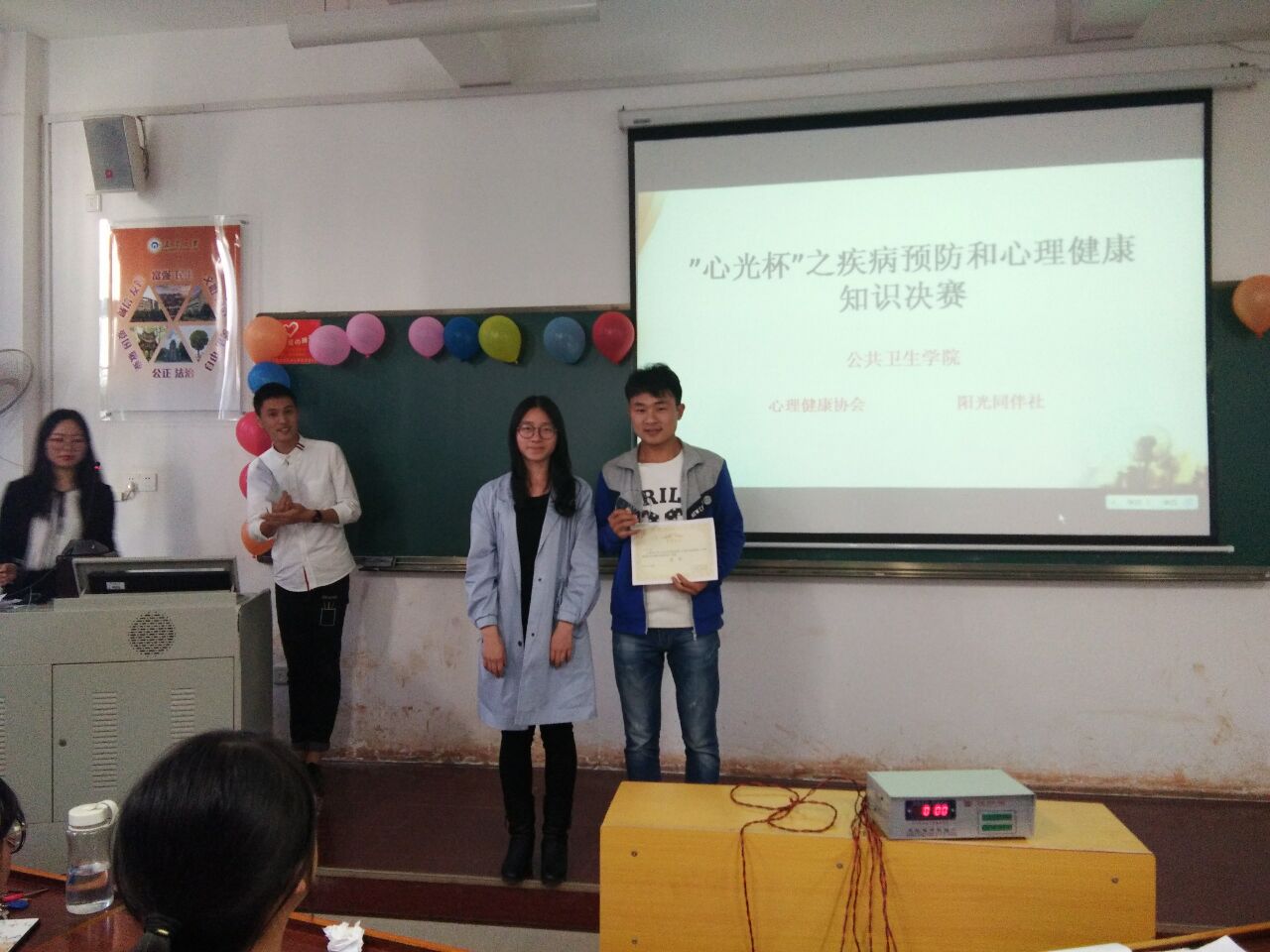 为了帮助大学生树立生理、心理上的健康意识,增加对常见疾病以及预防保健措施的了解,增强他们的心理调适能力。公共卫生学院阳光同伴社和公共卫生学院心理协会于2017年4月23日14:30在雨母校区逸夫楼103举办疾病预防和心理健康知识决赛。出席本次决赛的嘉宾有公共卫生学院团委书记涂彩蓉老师,心协主席汤洁,心协副主席李妹以及6支进入决赛的队伍和到场的观众。
