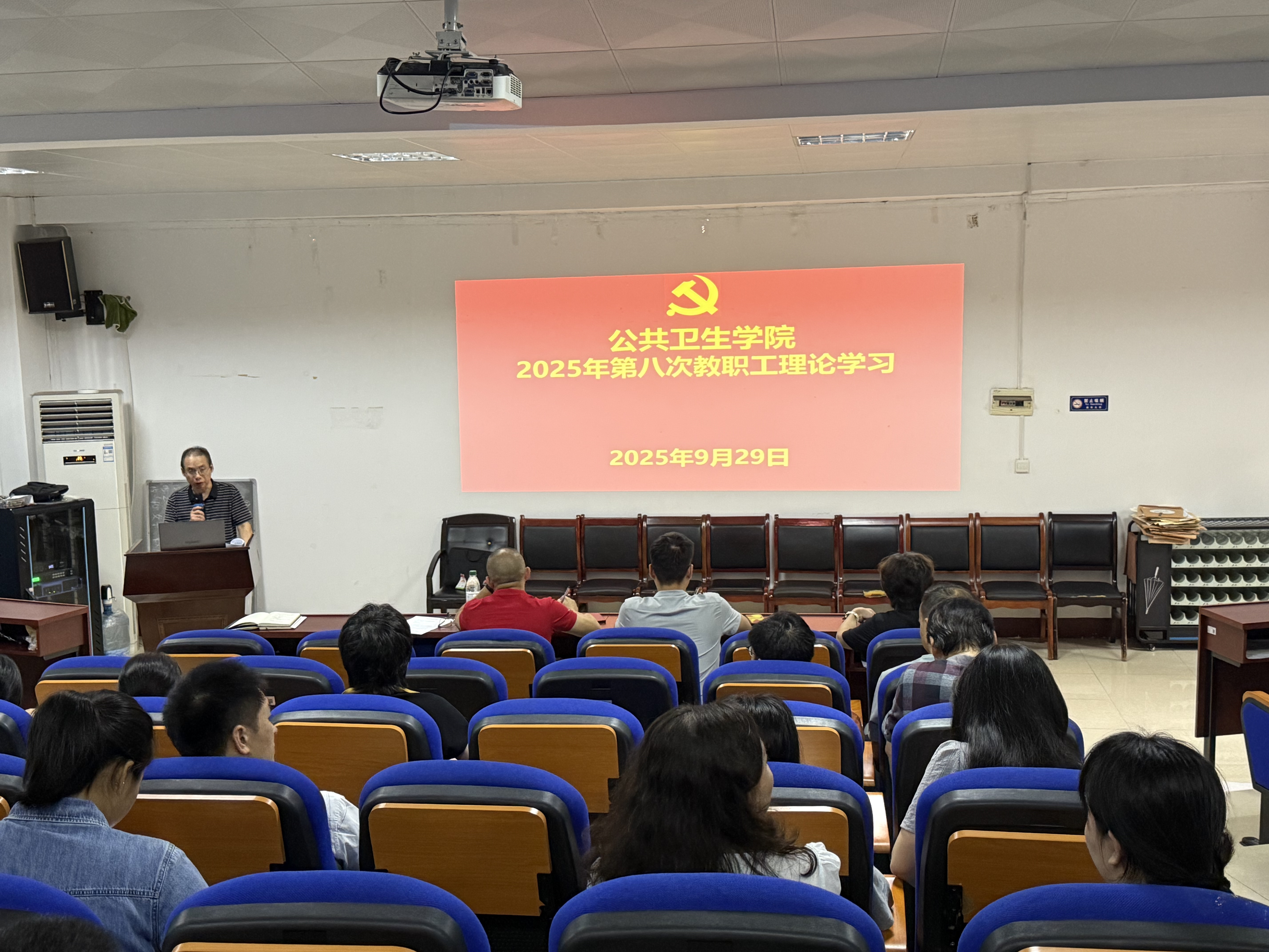 9月29日上午公共卫生学院在医学楼3-101报告厅开展2025年9月第八次教职工理论学习,本次会议由学院党委书记龙鼎新主持,全体教职工参会。