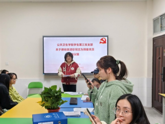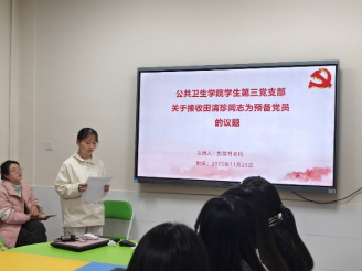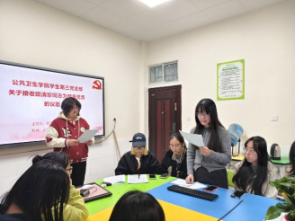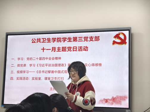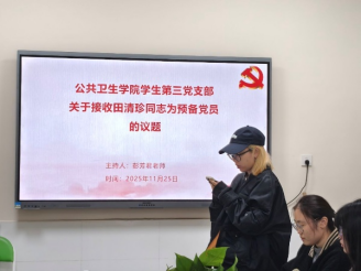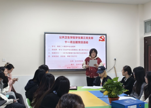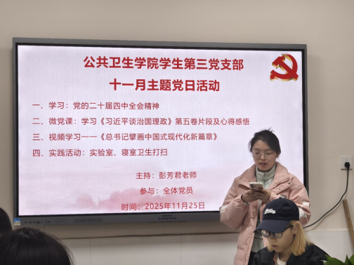 2025年11月25日下午3点,公共卫生学院学生第三党支部在第二办公楼121成功召开十一月主题党日活动与支部大会,组织全体在校党员深入学习党的二十届四中全会精神,开展《习近平谈治国理政》第五卷微党课学习,观看专题视频《总书记擘画中国式现代化新篇章》,并顺利完成接收田清珍同志为预备党员的议题。