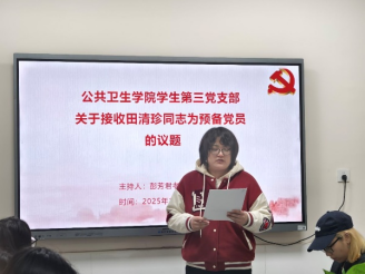 在支部大会上,发展对象田清珍同志向党组织汇报了个人基本情况、对党的认识、入党动机及在校表现。她表示,将始终以党员标准严格要求自己,积极向党组织靠拢,争取早日成为一名合格的共产党员。经过支部党员充分讨论和无记名投票,大会一致同意接收田清珍同志为中共预备党员。田清珍同志也表示将继续努力,不负组织的信任与培养。